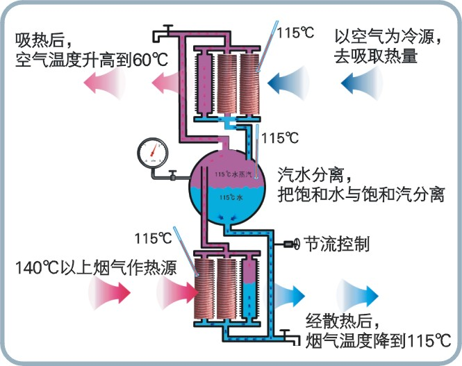相变换热器是在多根并联的密闭管排束构件内利用相变工质汽化潜热传递热量,相变下段的工质吸收热量汽化为饱和蒸汽,蒸汽在一定的压差下上升到相变上段,放出热量,然后凝结成液体,饱和工质经汽液分离器回到相变下段,并再次汽化,往复循环,完成了把热量从高端向低端的单向传导。整体相变换热器的整体壁面温度处于整体均匀、可调可控状态,换热器的壁面温度独立于被加热流体的温度,可根据燃料的酸露点进行设计,避免露点腐蚀。